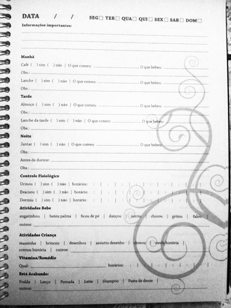 R. Sugiro que você compre um caderno especialmente para os relatórios diários referentes à rotina da bebê (tipo agenda escolar). Ele vai virar mais um meio de comunicação com ela. E o melhor é que tudo ficará bem organizado e registrado. Nele devem conter as seguintes informações: