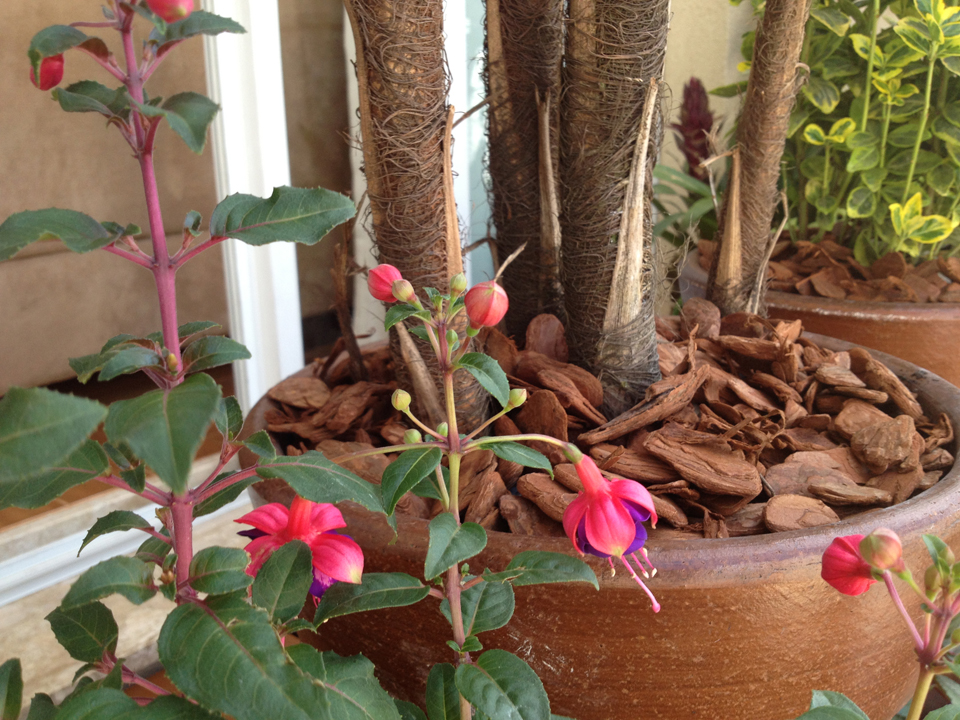 Brinco de princesa. Minha filha adorou ter uma flor com esse nome no jardim. No vaso ao lado, cascas de árvore para cobrir a terra e deixar tudo mais bem acabado (foto: It Mãe)