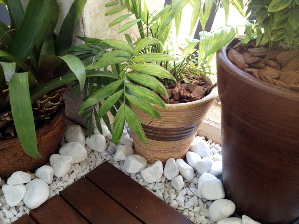 Entre um vaso e outro, pedrinhas brancas de dois tamanhos. Capricho da mama. Esta planta em destaque é a palmeirinha - baratinha e linda (foto: It Mãe)