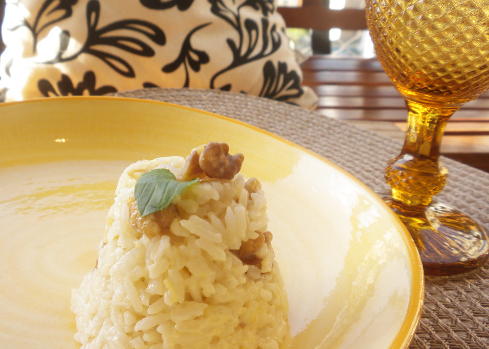 Para fazer uma apresentação digna de bistrô, coloque uma porção do arroz repaginado dentro de uma xícara de chá e vire-a no seu prato. Vai ficar como o da foto. Decore com um folha de manjericão e com um pedaço de nozes (ou com o que tiver colocado na mistura). Pode servir!