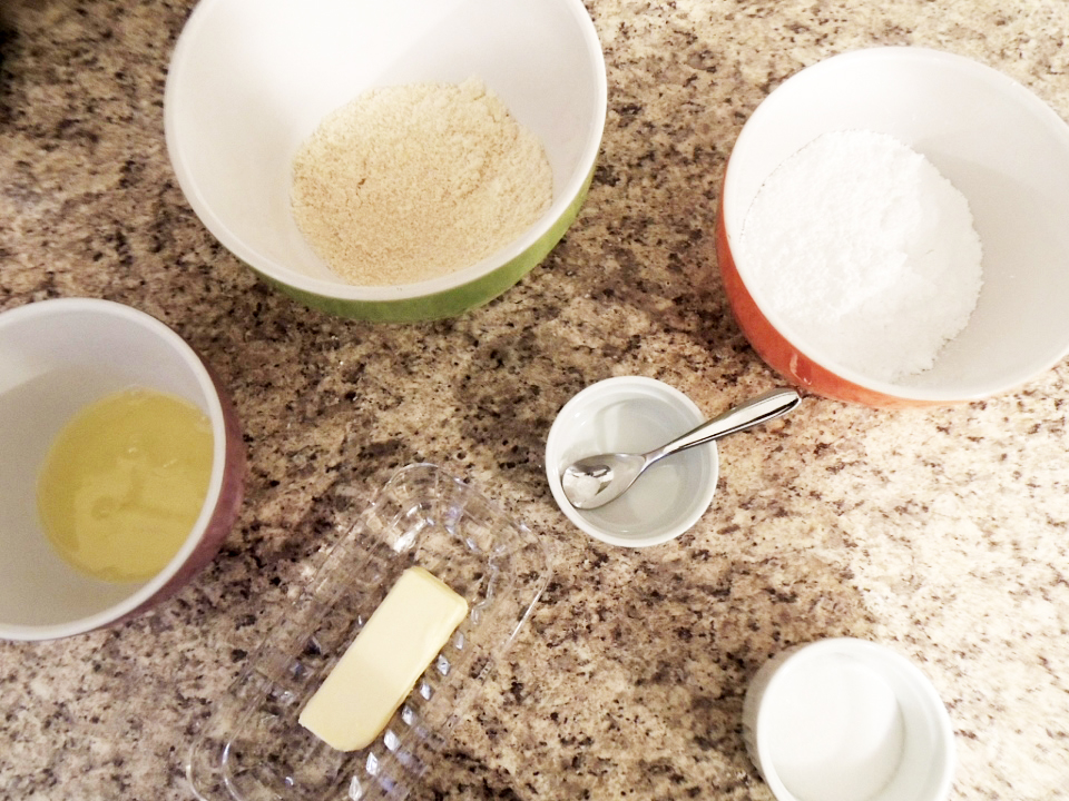 Para a massa, você vai precisar de 3 claras de ovos (grandes), ¼ de xícara de açúcar, 2 xícaras de açúcar de confeiteiro, 1 xícara de farinha de amêndoas, uma pitada de sal e corante da cor de sua preferência (foto: Monique dos Anjos)