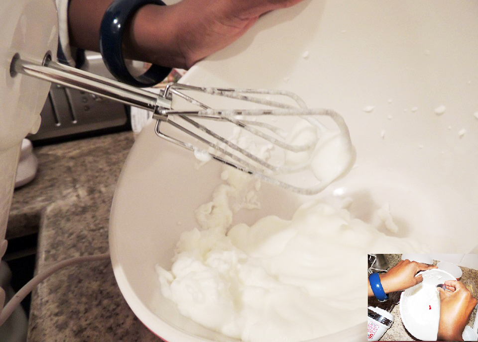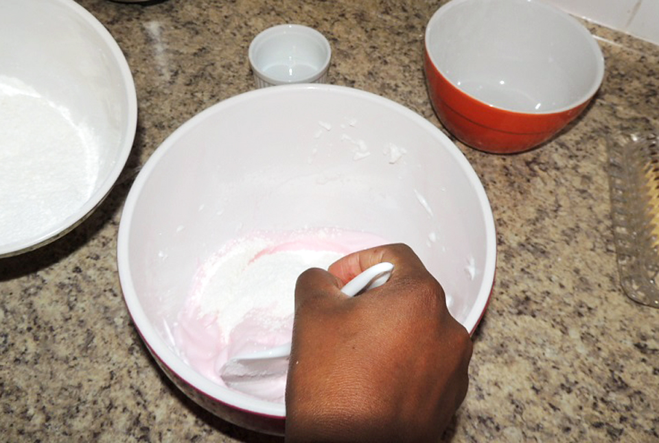 Coloque as claras em um recipiente, acrescente uma pitada de sal e bata até o ponto em que não haja mais líquido no fundo. Quando estiver em neve, acrescente o açúcar regular, misture bem e inclua uma gota ou mais de corante (foto: Monique dos Anjos)