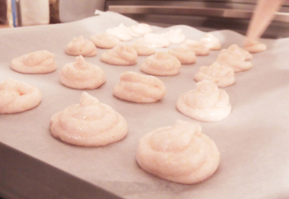 Com um bico de confeitar faça círculos rasos e pequenos em uma bandeja forrada com papel manteiga. Dê leves golpes contra a mesa para liberar bolinhas de ar. Deixe repousar por meia hora antes de levar ao forno aquecido a 150 graus. Demora de 15 a 20 minutos para assar (foto: Monique dos Anjos)