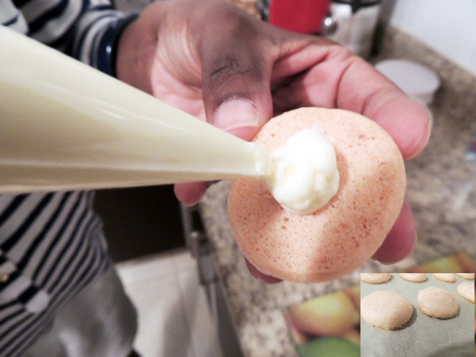 Tire os macarons do forno e aguarde 10 minutos antes de manuseá-los. Use o bico de confeitar para colocar o recheio e faça sanduiches (foto: Monique dos Anjos)