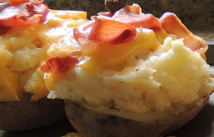 Acrescente o sour cream, a manteiga e os temperos. Misture bem, até atingir a consistência de purê. Transfira essa massa de volta às cascas, coloque o queijo ralado por cima e depois o proscuitto. Leve ao forno por mais dez minutos ou até que o queijo derreta (foto: Monique dos Anjos)