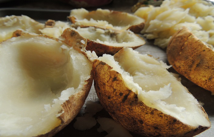 Retire do forno e deixe esfriar por alguns minutos. Corte as batatas ao meio e utilize uma colher para retirar a batata da casca sem rompê-la.Reserve a casca e coloque a batata raspada em uma tigela (foto: Monique dos Anjos)