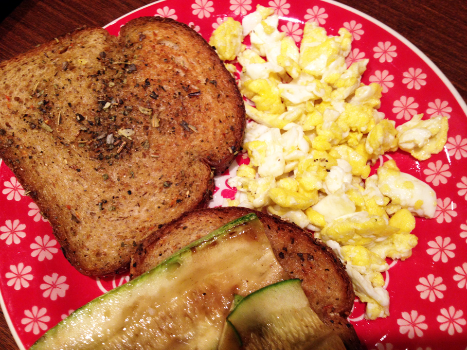 Enquanto isso, coloque mais 1 colher de azeite na frigideira, sal a gosto e faça um ovo mexido. Quando estiver pronto, retire o pão do forno elétrico e monte seu sanduíche. Di-vi-no!
