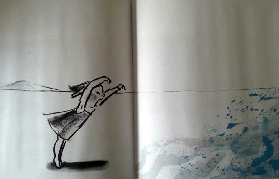 Não sou só eu que estou dizendo que este livro é especial. Suzy Lee ganhou diversos prêmios pelo mundo com este livro e a trilogia que o título compõe com Espelho e Sombra tornou-se best-seller. Com desenhos em grafite e carvão e um pouco de azul, Onda narra a primeira vez de uma menina na praia e transforma a ocasião numa verdadeira experiência de descoberta e encantamento. A menina dá de frente com aquela imensidão que é o mar e se assusta com tanta água. Depois chega mais perto. Experimenta, brinca, ousa, surpreende-se, testa os limites, encontra os limites, se diverte…tantas emoções se passam naquele momento que é difícil não nos encantarmos juntos, ora na pele da menina, ora como se fossemos o adulto que presencia tão de perto um encontro de tamanhas proporções. E Suzy Lee mostra tudo isso sem usar uma única palavra. O encantamento da menina pelo mar me emociona. Remete-me, com muita poesia, à descoberta do primeiro livro favorito e de tantas outras coisas importantes da vida. E não são essas as experiências que nos marcam pela vida toda?