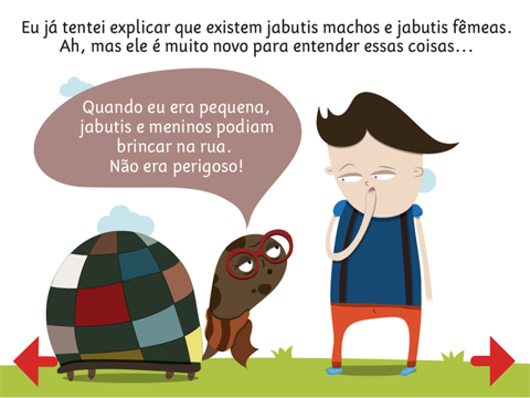Adivinhe quem é que mais usa em casa o iPad aqui em casa? O Fe, de 2 anos. Se a gente bobeia, ele vai lá, pega quietinho e já entra (onde?onde?) no Angry Birds e fica numa concentração absurda. “Mamãe, fiz recorde”, ele fala. E justo agora que o pequeno está nessa fase toda tecnológica (coincidências da vida???), chegou em minhas mãos (ou melhor, no meu e-mail) um novíssimo livro infantil digital: Karen, a Velha Tartaruga do Pedro. Amei, baixei no iPad e as crianças amaram também (porque quiseram assistir uma, duas, três vezes seguidas). A história inédita, criada por Filomena, psudônimo da jornalista, escritora e também editora de livros Isabel Malzoni, é uma das primeiras produções nacionais feita exclusivamente para tablet (também pode ser baixada no Android). Fala da amizade de uma tartaruga ranzinza e um menino. A narração é feita pela voz rouquinha da tartaruga e as crianças podem ouvir a risada do Pedro e até fazer uma árvore crescer quando tocam na tela. Custa 1,99 dólares.