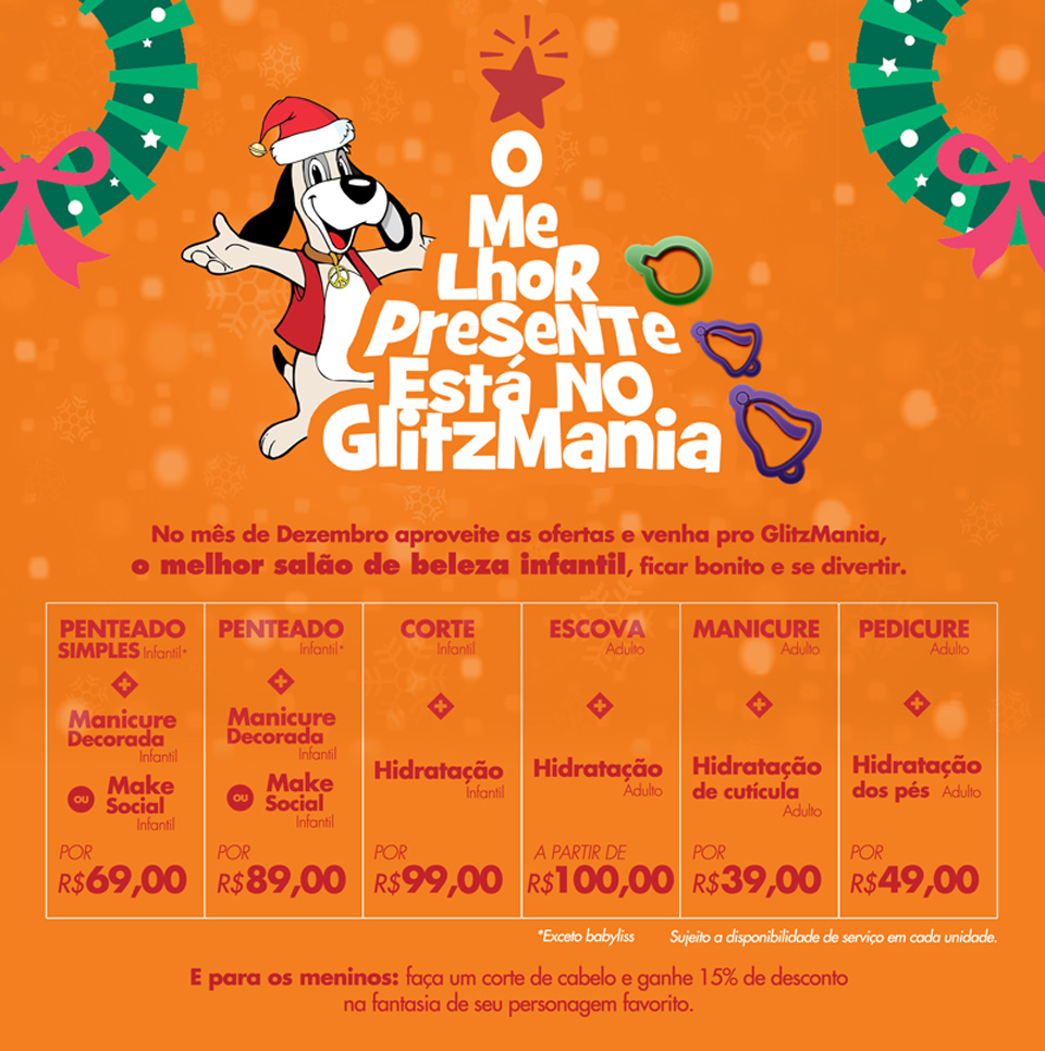 Que tal aproveitar para dar um up no visual dos pequenos nas férias? Os meus filhos adoram o Glitz Mania, que tem brinquedão, brinquedoteca e profissionais super especializados em crianças. Eu também adoro, porque há alguns serviços para mães também, como manicure, escova… E ainda tem uma lojinha que vende fantasia, brinquedinhos – dá até para achar lembrancinhas de Natal para os filhos das amigas. Amo lugares que ajudam a gente a resolver tudo ao mesmo tempo agora. Otimização do tempo! Uma das novidades para dezembro e janeiro, nas lojas de São Paulo, são os combos especiais. Um deles é quaaaase uma transformação de princesa, no estilo Disney. Ideia de presente de Natal diferente para sua menina. Também é uma mão na roda se ela vai dançar no espetáculo do fim do ano do ballet. Eles fazem coque , maquiagem e tudo. Para janeiro, a pedida é o corte + hidratação. Ideal para a volta das férias na praia. Para facilitar a sua vida, pedi para o Glitz a tabela dos combos, está aí embaixo. E saiba qual é a unidade mais próxima de você aqui!