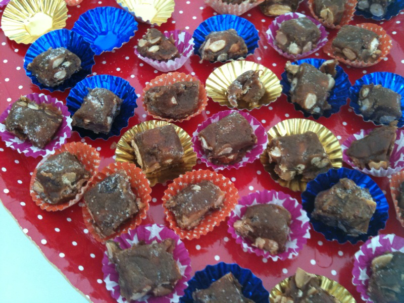 Bem, voltando ao doce. Cada pé de moça (feito com amendoim, leite condensado e açúcar) é enorme – e até enjoativo se você for comer inteiro. Então, o segredo é cortar em quadradinhos e ir colocando nas forminhas – cada pé de moça rende 9 docinhos (sim, fica baratésimo). O truque da forminha: compre vários modelos daquela mais simples mesmo e vire do avesso. Assim, o doce aparece mais e a estampa também. Coloque em bandejas de papelão colorido e não conte o segredo para ninguém. Todo mundo vai amar. Garanto!