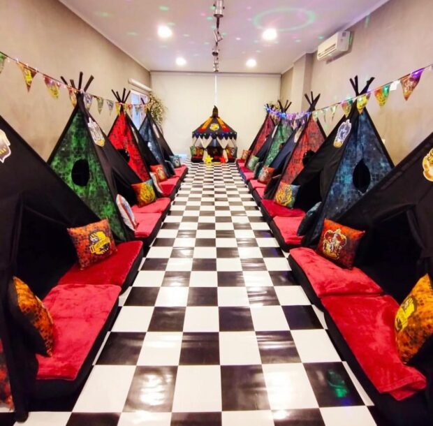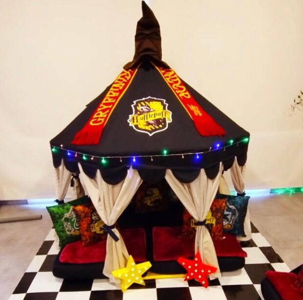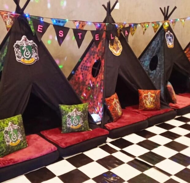 - É perfeito para criar ambientação: tendas como salões de Hogwarts, chapéu seletor, luzes baixas e snacks “mágicos”.