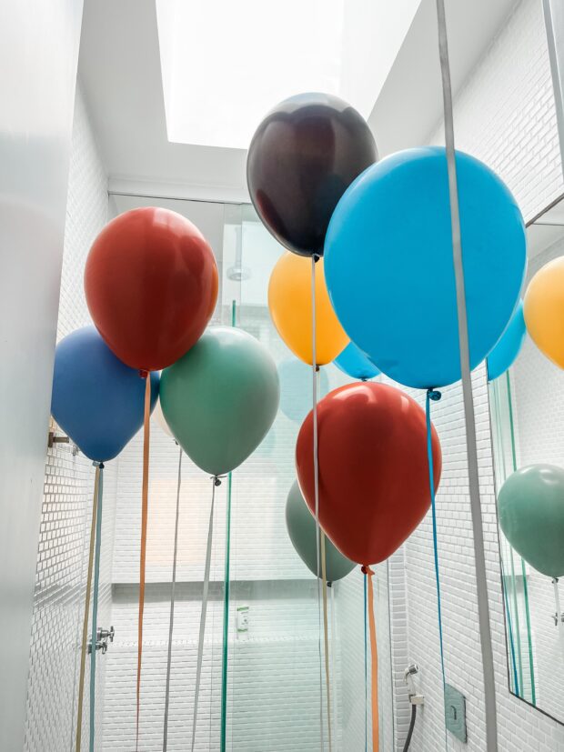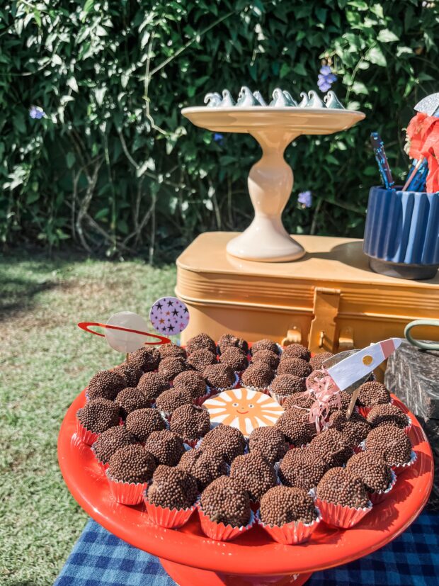 O clima “feito em casa” também estava presente em cada cantinho da décor. As mochilas que imitam propulsores de foguete, feitas com garrafa pet, são um ótimo exemplo de como um toque artesanal e sustentável pode deixar tudo ainda mais especial.
