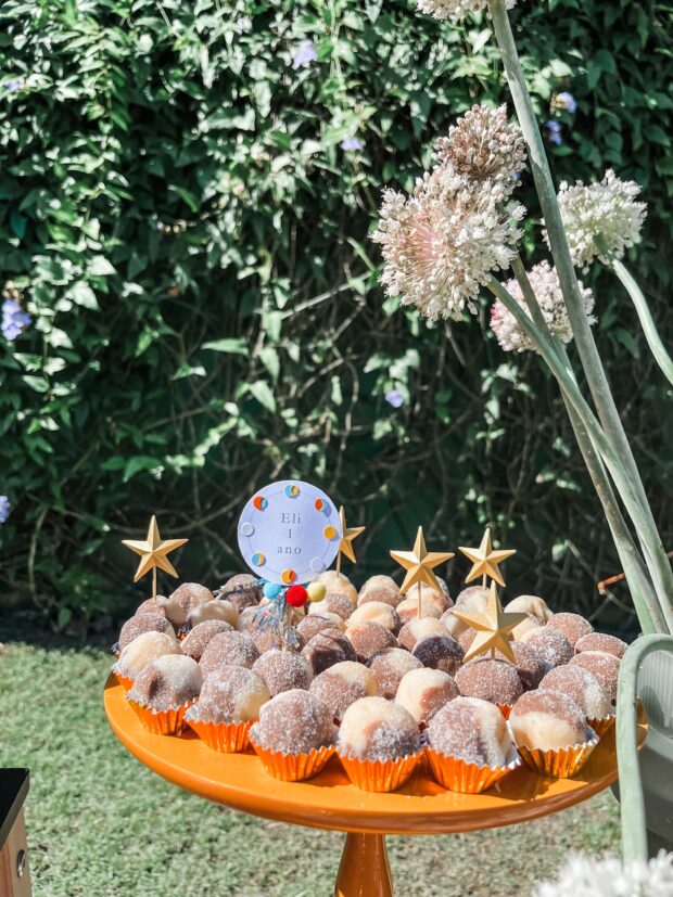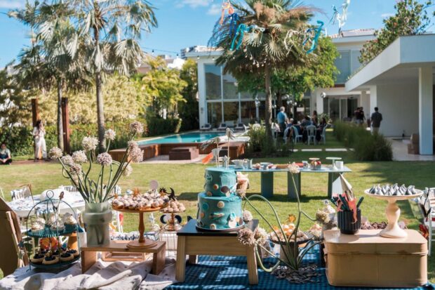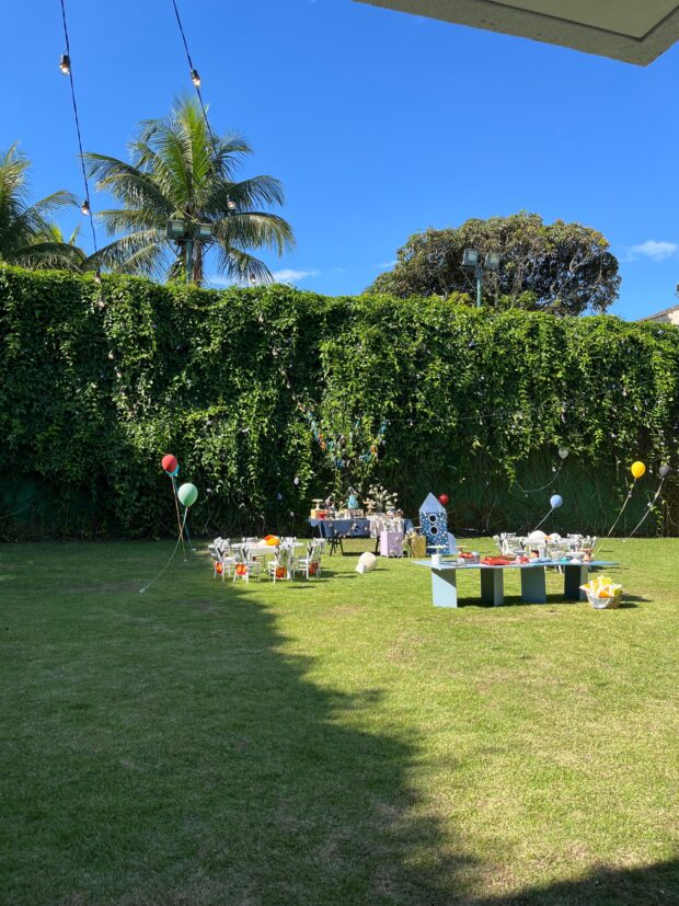 O bolo centralizado no gramado, as flores leves e as mesas baixas completaram a ambientação charmosa, com cara de almoço em família, no melhor estilo petit comité. Para a criançada, teve uma mesa especial com desenhos de foguetes, objetos reciclados transformados em brinquedos e lembrancinhas feitas à mão. Tudo com afeto, propósito e bom gosto. Uma festa linda, com alma, leveza e aquele frescor que só um dia ensolarado no jardim pode trazer e o melhor de tudo – uma ótima inspiração para quem também é fã de receber em casa.