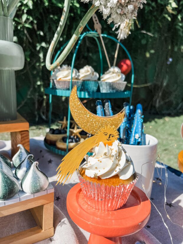 A cartela de cores usadas pelo Atelie de Ana Carolina Arrigoni, em tons de azul, laranja e toques metálicos, foi o ponto de partida para toda a identidade visual. Dos foguetes aos planetas, cada detalhe foi pensado para criar uma atmosfera lúdica e sofisticada, fugindo do óbvio das festas infantis temáticas.