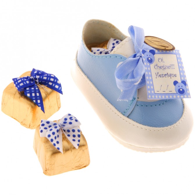 Sapatinho com dois bombons (um de krisps, outro de nougat). O kit com 20 unidades custa R$ 460. Tem rosa também (foto: divulgação)