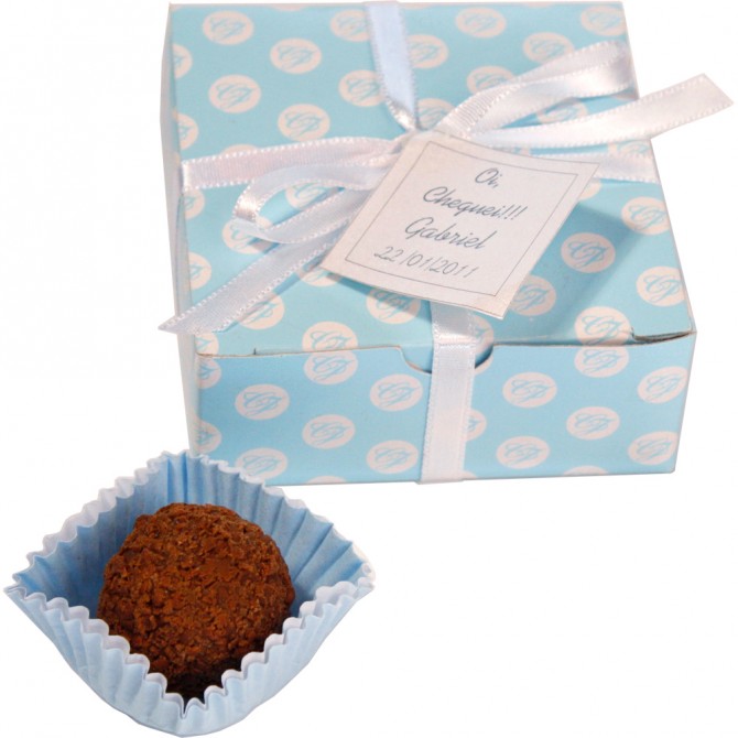 Caixa com quatro bombons brigadeiro. O kit com 30 caixas custa R$ 432. Tem rosa também (foto: divulgação)