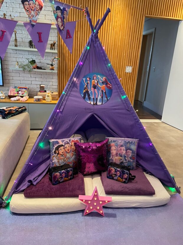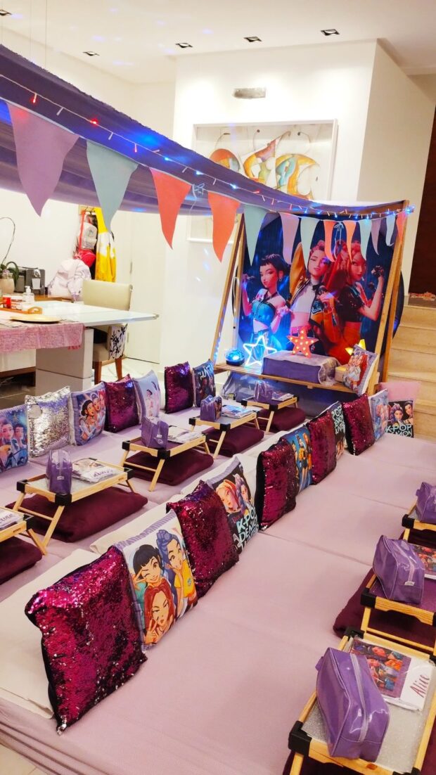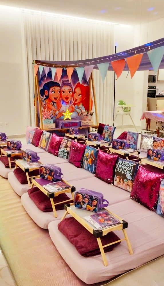 Já o tema das Guerreiras do K-pop traduz a força da música, da dança e da identidade pop em festas cheias de cor, atitude e movimento. Mistura referências do universo dos girl groups, luzes coloridas, elementos holográficos e detalhes inspirados nos palcos, criando um clima de show particular. Coreografias viram brincadeira, playlists viram trilha sonora oficial da noite e cada convidada assume seu próprio papel de estrela, em uma celebração que exalta autoestima, expressão e espírito de grupo.