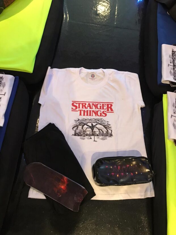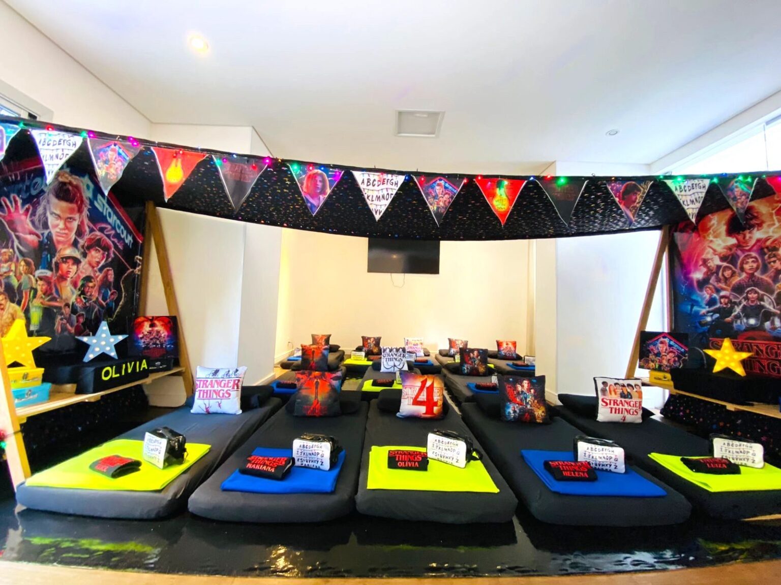 A ambientação de Stranger Things aposta em luzes mais baixas, tons de vermelho e azul, elementos que remetem ao Mundo Invertido e objetos que evocam os anos 1980, como lanternas, bicicletas, fitas e jogos clássicos. A proposta cria um clima de mistério, perfeito para sessões de cinema, jogos em grupo e desafios noturnos, sem perder o tom lúdico que a infância pede.