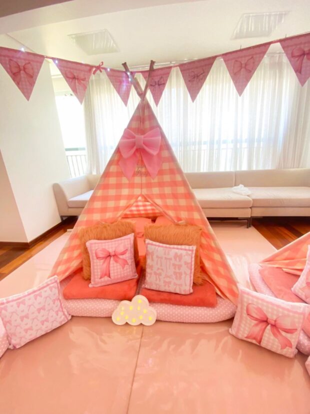 No universo mais delicado, os laços em tons de rosa seguem firmes como símbolo do estilo girlie, trazendo suavidade, charme e um clima acolhedor que transforma a festa em um refúgio de afeto.