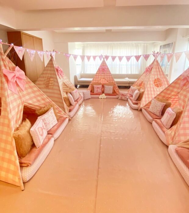 As cabanas individuais continuam a ser muito procuradas, mas dividem espaço com tendas coletivas organizadas de forma harmônica, com colchonetes individuais e acessórios personalizados para cada convidado. Pijamas, máscaras faciais, baldes de pipoca, pantufas e detalhes pensados um a um ajudam a criar uma atmosfera intimista, quase cinematográfica.