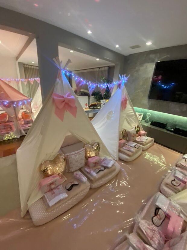 A decoração transforma a noite do pijama em uma experiência imersiva, quase cinematográfica, onde cada detalhe ajuda a contar uma história.