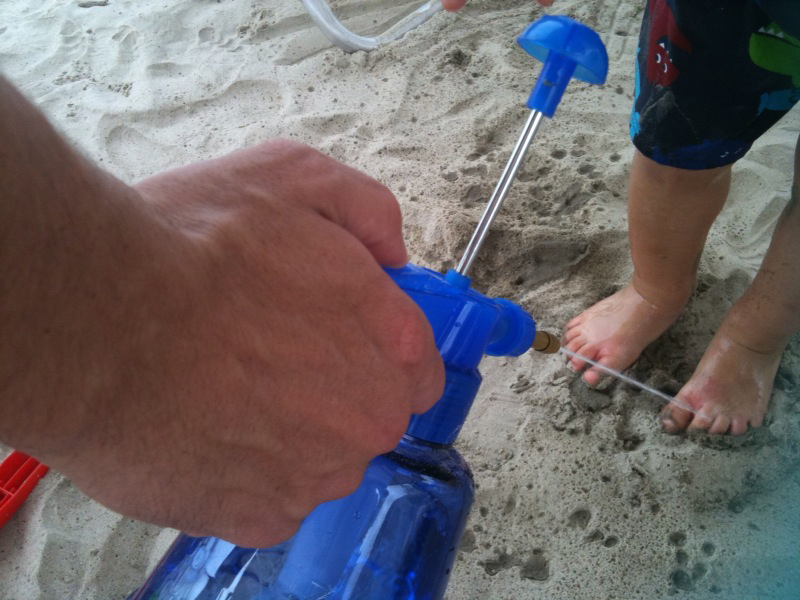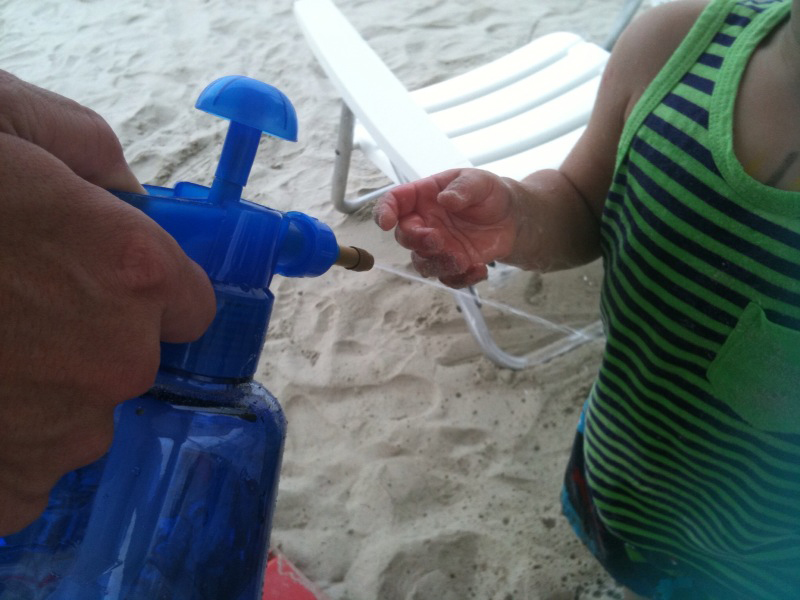 O título deste post parece até propaganda enganosa. Afinal, como conseguir manter as crianças longe do visual à milanesa na praia? Depois de muitas tentativas frustradas (com baldinhos e garrafas d’água), minha mãe – super it avó – achou uma solução: levar esse spray na sacola de praia. Não se trata de um spray qualquer. Ele funciona com uma bomba de ar e tem regulagem de jato (mais fraquinho para o rosto, mas forte nos pés e em lugares em que a areia fica impregnada). Super prático para tirar areia e água salgada antes de reaplicar o protetor solar. Não, não é vendido na Alô Bebê. Você encontra em casas de artigos de jardinagem. Fica a dica.