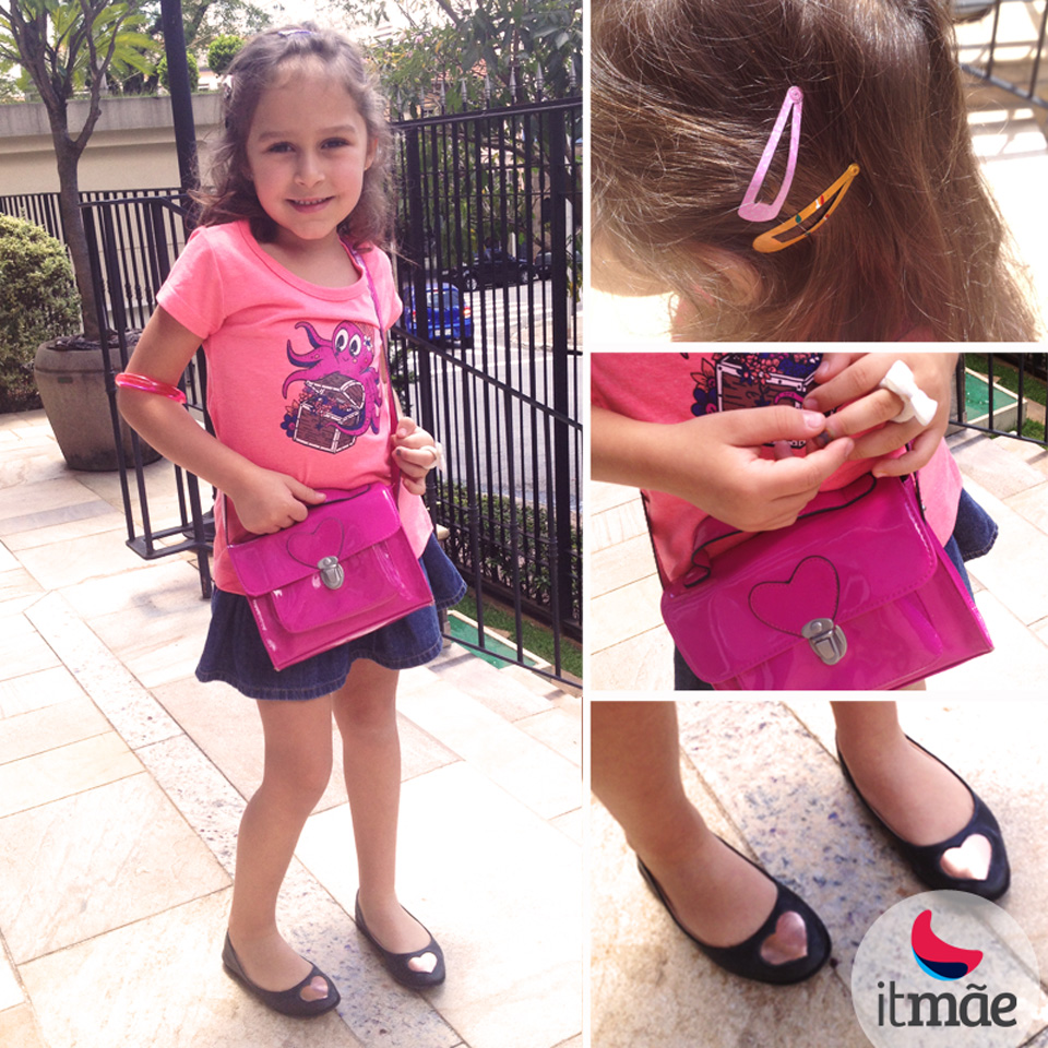 Ai gente,não aguentei, fotografei (óóóbvio) e postei. Olha só o que acontece quando a filha da gente resolve escolher a roupa. Ok, algumas vezes o pink fala beeem mais alto e ela aparece na sala de cor da Barbie da cabeça aos pés. Mas dessa vez, ficou fofa demais! Camiseta divertida, saia jeans (com shorts por baixo), sapatilha romântica. E olha só a pulseira e o anel (sim, Beloca usa mais acessórios que a mãe!). O penteado com fivelas tic tac também é de autoria da minha fofinha 😉 #orgulho. Acho muito divertido ver que ela está descobrindo (e curtindo) o próprio estilo.