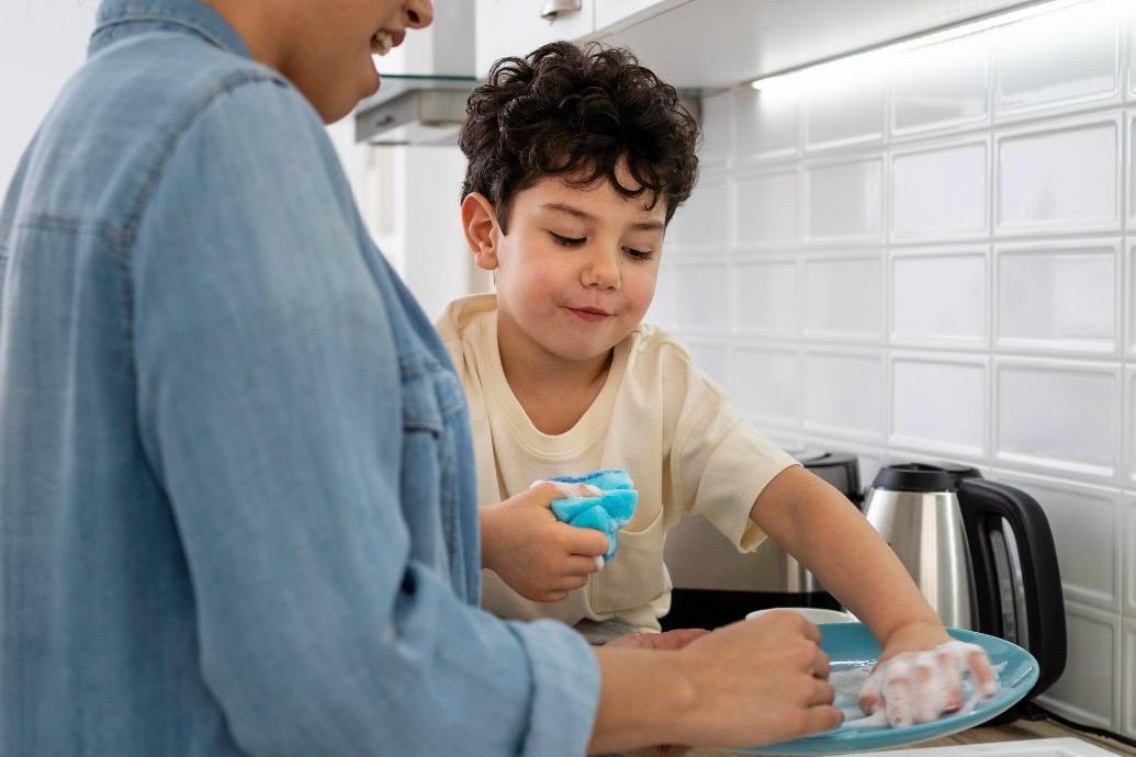Com o crescimento, as crianças já conseguem executar tarefas mais estruturadas e começam a compreender que cuidar da casa é uma responsabilidade compartilhada.