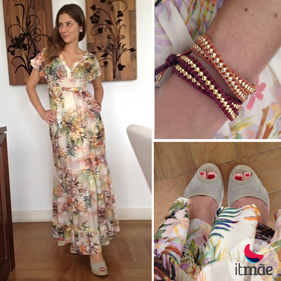 O ótimo vestido também é aquele super confortável, que não deixa você constrangida no abaixa e levanta com as crianças. Por fim, cai bem numa festinha na cidade (com espadrilha – esta é da Cervera Alpargateria) e na praia, com rasteira (o segredo para um modelo longo ir bem com salto alto e baixo é fazer a barra bem no limite do calcanhar). Esse da foto, da Zara, cumpre todos os critérios. E, como a estampa já chama atenção, não requer muitos acessórios. Fiquei apenas com essas pulseirinhas de couro e ouro da Sophie & Juliete.