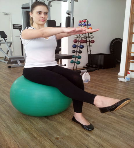 Sentada em uma bola suíça* ou cadeira – *só usar a bola se já tiver experiência com esse tipo de material. O exercício realizado na cadeira também é muito eficiente.