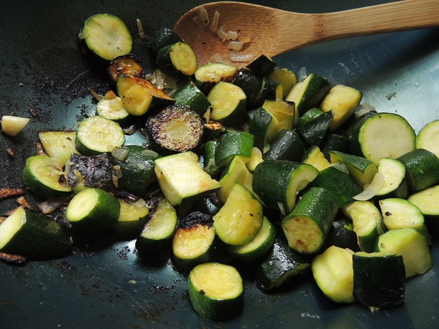 Em uma panela, frite a cebola e o alho picado na manteiga. Acrescente a abobrinha cortada em pedaços pequenos, tempere com sal e pimenta e refogue por dez minutos ou até que amoleçam. Desligue o fogo apenas quando a abobrinha estiver prestes a queimar. Assim você obtém um sabor “defumado” extra (foto: Monique dos Anjos)