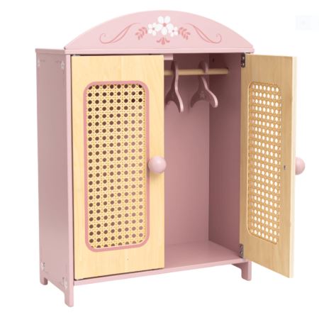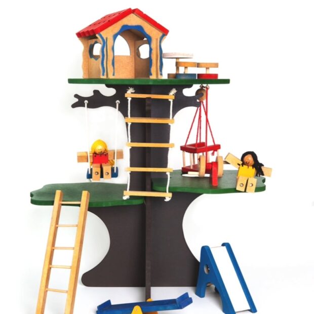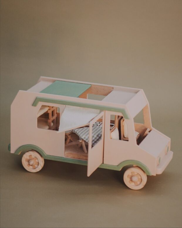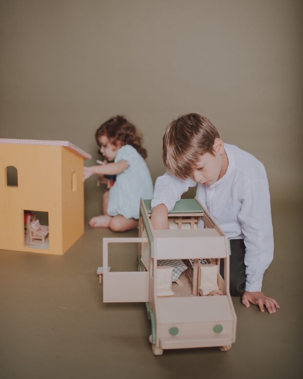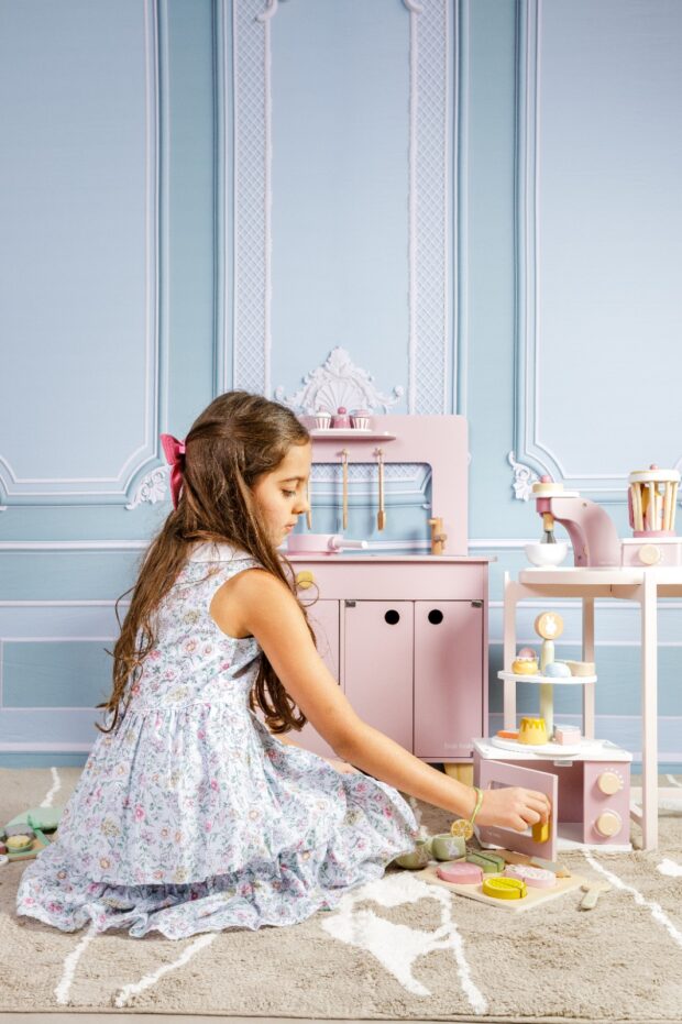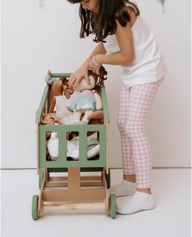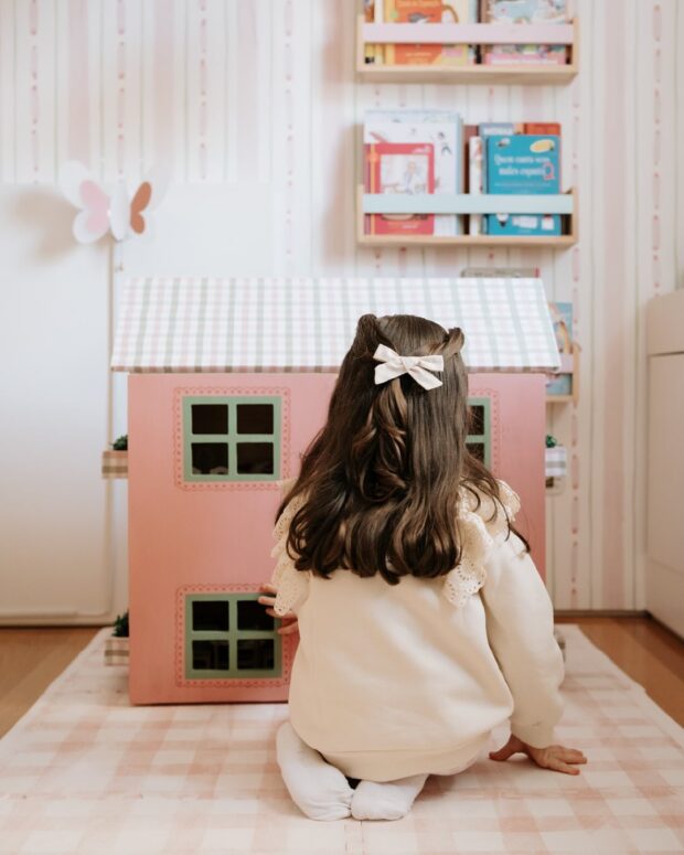 Entre os lançamentos, objetos que elevam o brincar simbólico: guarda-roupa de bonecas, cadeirão para alimentá-las e acessórios que transformam o faz de conta em cuidado. A madeira, os acabamentos delicados e a funcionalidade pensada para mãos pequenas criam um universo onde brincar também é organizar, acolher e imaginar.