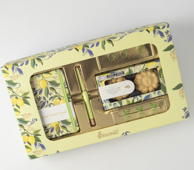 Este kit tem caderno, caneta e biscoito de limão siciliano, R$ 119,90, Biscoitê(foto: divulgação)