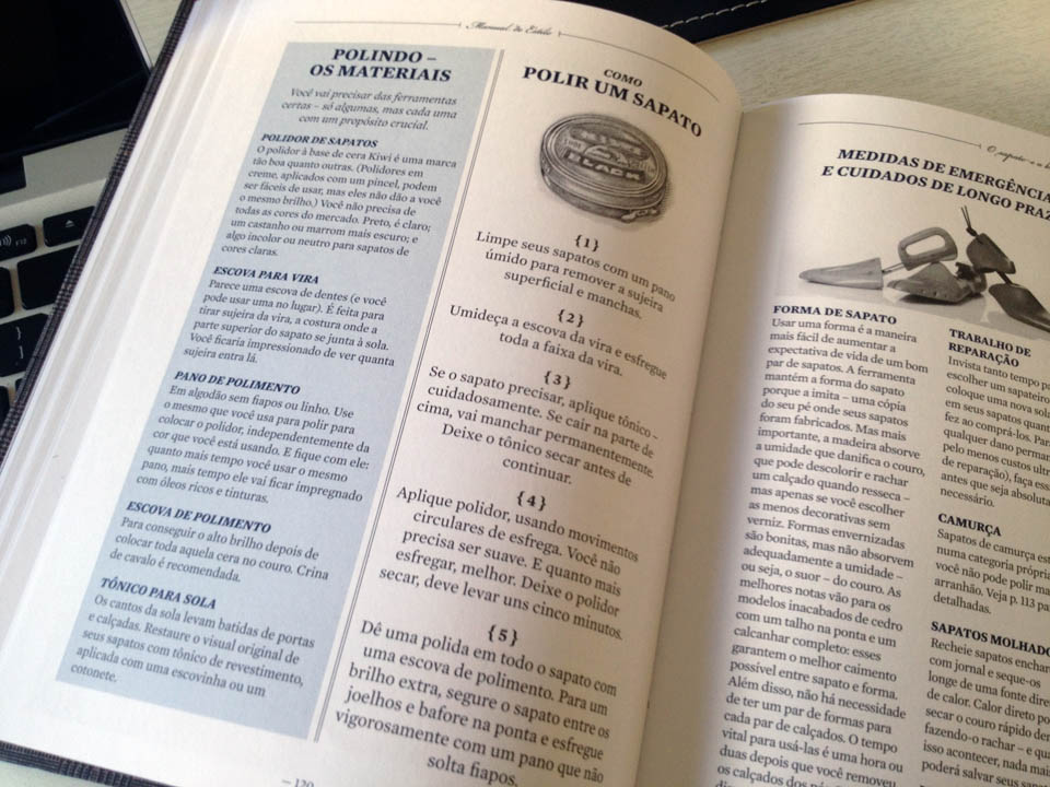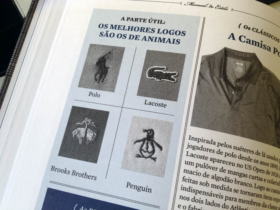 Adorei porque além de ter muitas fotos no estilo “how to” e dicas muito práticas – que vão do tamanho ideal da barra da calça a como polir um sapato (sim, homens precisam saber fazer essas coisas!), ele tem também vários momentos de culturinha. Um deles? A clássica camisa polo Lacoste surgiu de uma ousadia do campeão de tênis René Lacoste. Em 1926, ele usou o modelo em uma partida contrariando a regra de usar mangas longas. A camisa virou um clássico. E sabe porque tem um jacaré como logotipo? Porque o apelido de René nas quadras era Le Crocodile. Simpática a história, né?